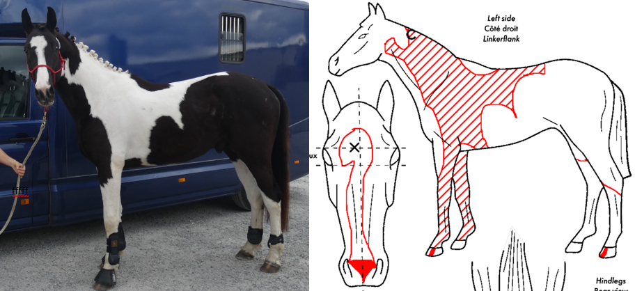 Si une marque blanche (en-tête, liste ou balzane) est continue avec une marque pie, il n’est pas possible de distinguer la démarcation : l’ensemble est alors considéré comme une marque pie.
